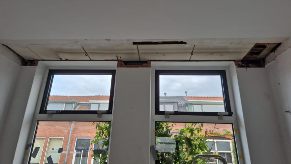 Binnen hebben we het plafond deels gesloopt, de stoffige koof bij het raam heeft geen nut meer. Hopelijk valt de reparatie mee.