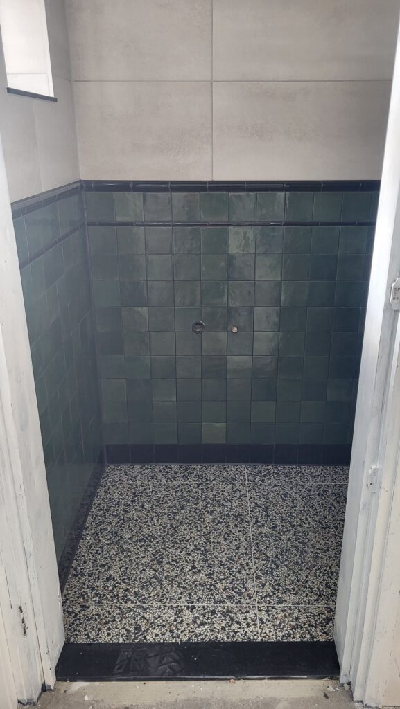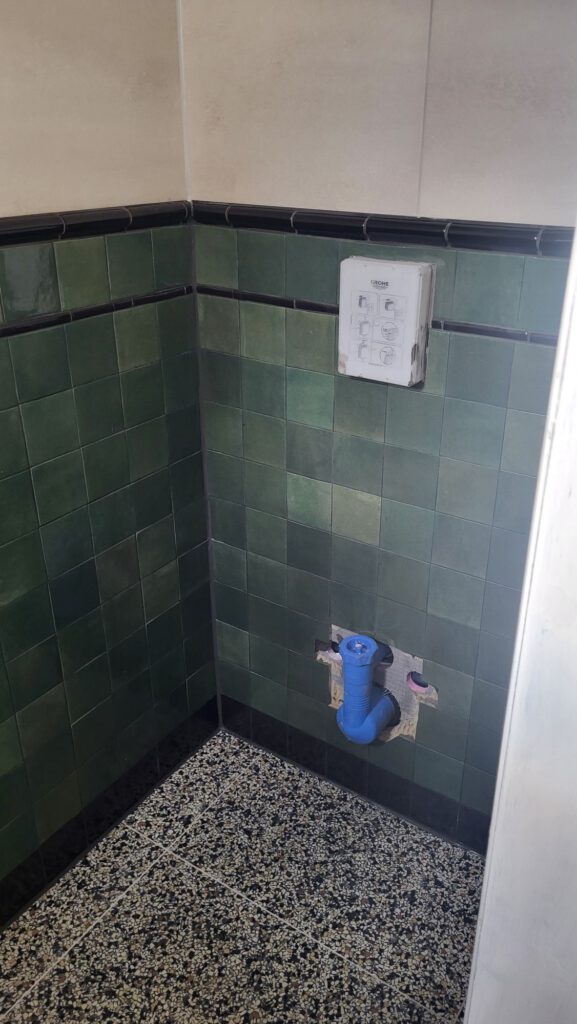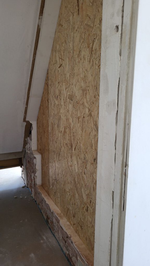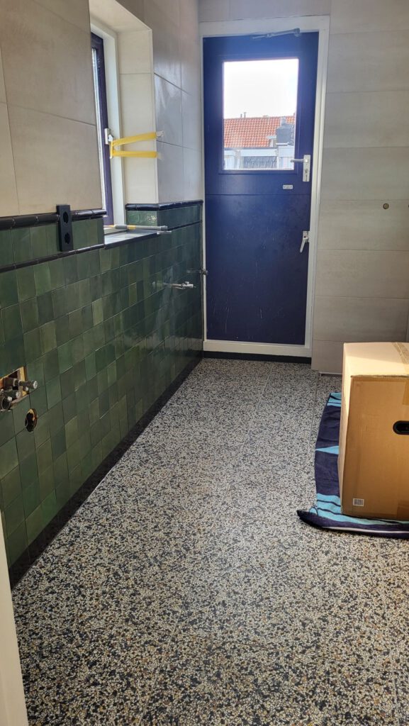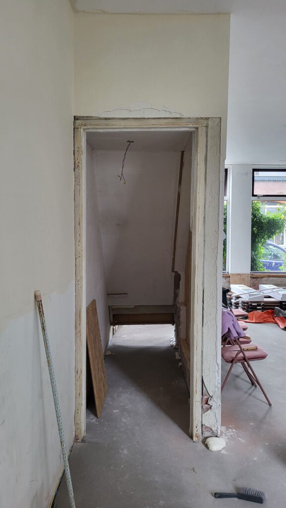De aannemer heeft deze week, in tropische temperaturen vanwege het opstookprotocol van de vloerverwarming, de badkamer afgevoegd en het toilet betegeld. Ook de trapkast is nu definitief weer een kast en geen halfopen ruimte. Wat fijn dat beneden ook vorm krijgt zo.