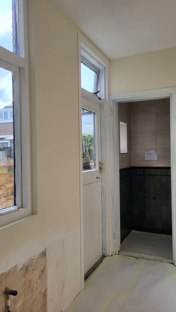 De keuken heeft inmiddels hetzelfde lichte kleurtje gekregen als boven, oat biscuit, en wat geeft dat een zonnig gevoel! Heel erg blij mee. Ook de woonkamer heeft grotendeels een verflaag gekregen – tot op hett niveau van de lambrisering. Stap voor stap komen we er wel!