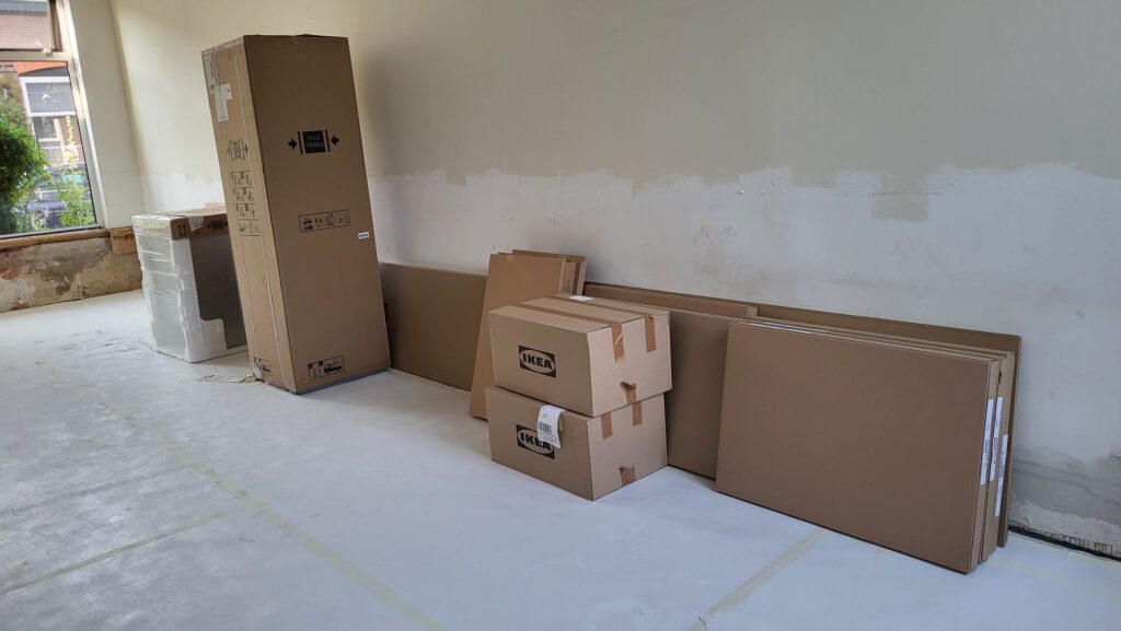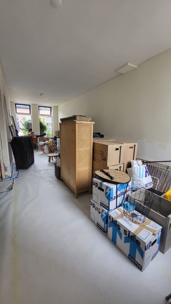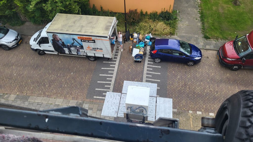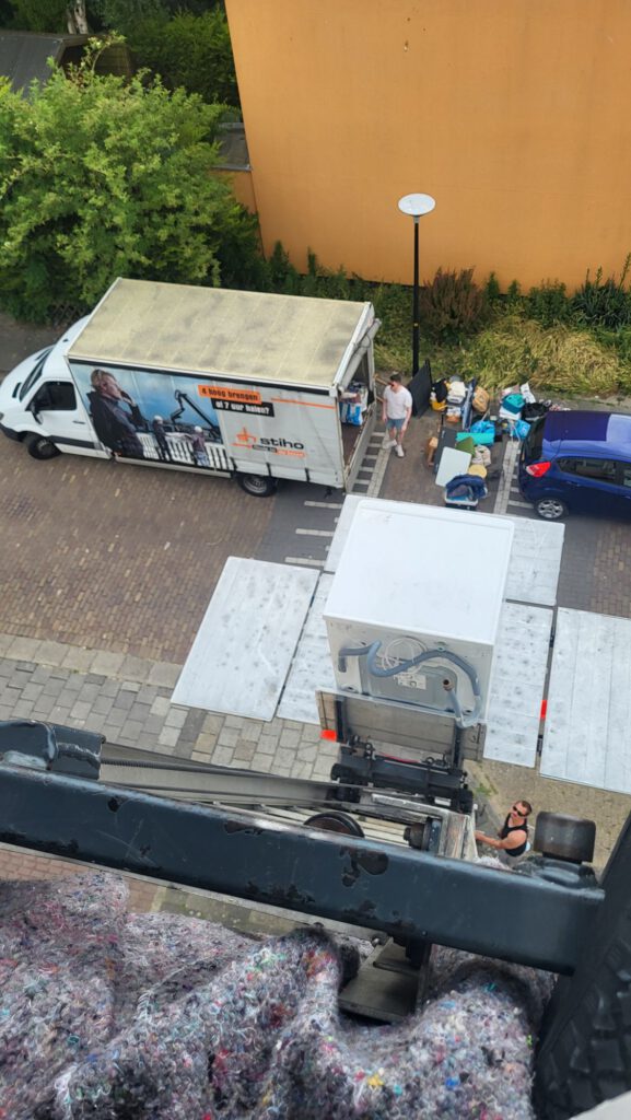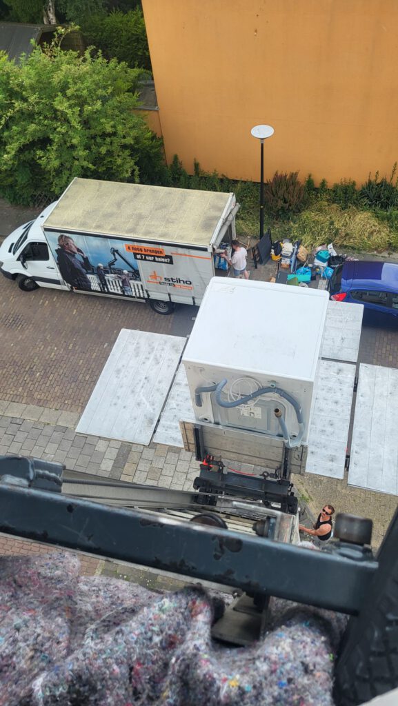 Wie heeft bedacht dat het tropisch warm zou worden, precies dit weekend, wens ik heel veel jeuk en te korte armpjes. Wat een werk hebben we verzet, en wat was het warm! Ontzettend blij met Yannick en Lotte – met vrachtwagen. En met Tom, die zijn vrije brakke zaterdag opofferde om mij te helpen. Sta voor eeuwig bij je in het krijt, allerfavorietste collega! Met Jay, onvermoeibaar ontelbaar keer alle 7 trappen aan de Lobelia op en af. Met Yestin, die alle meubels uit elkaar heeft geschroefd. En last but zeker not least, met pa, die er tijdens deze enorme verbouwing elk weekend (en flink wat avondjes, en vergeet de drie vrije weken niet) voor me staat. Ook nu weer ♡. Ook superblij met het liftje en de verhuizers. Eentje nogal nors, de ander vrolijker. Met alle inspanning was de Lobelia binnen 2 uur zo goed als leeg. En vervolgens door naar de Vondel, waar mijn woonkamer vol staat met dozen, halve meubels en de rest van mijn levensrommel. Naast de IKEA keuken, ook nog in doos.