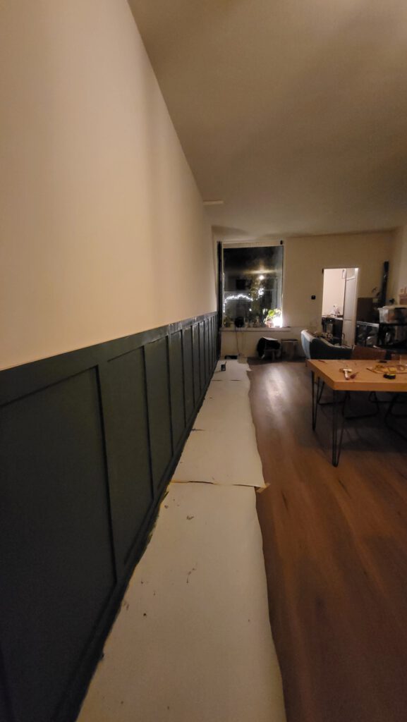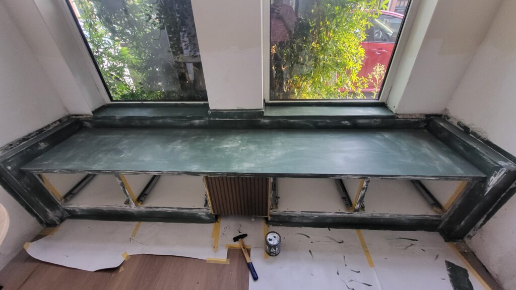 Terug op m’n stek gaan we gestaag door. De lambrisering beneden zit er op en staat in de lak, de ingebouwde bank is groen en heeft ook een prachtig lang kussen op maat. Een nieuwe bank uitgekozen, hij wordt heel mooi roze… Duimen dat de levering in week 8 ook wordt gehaald.