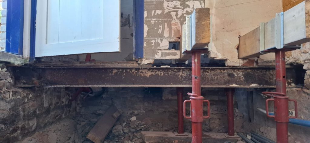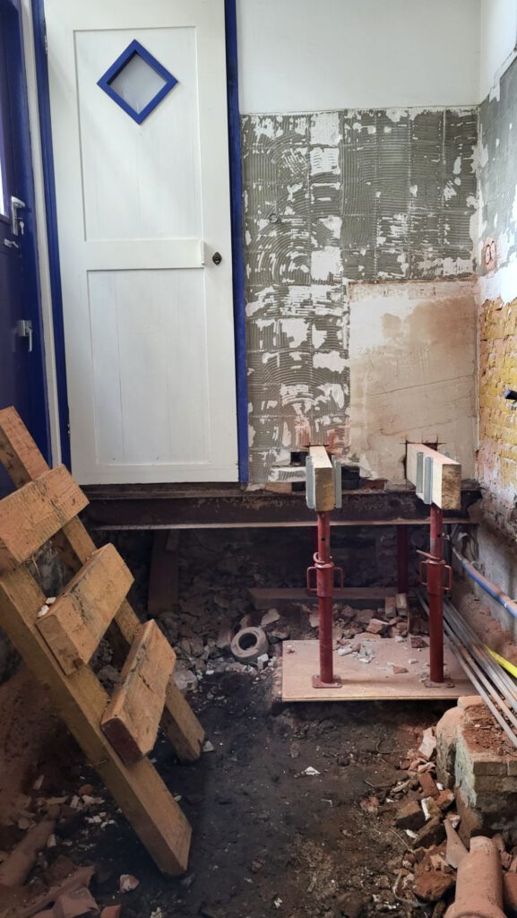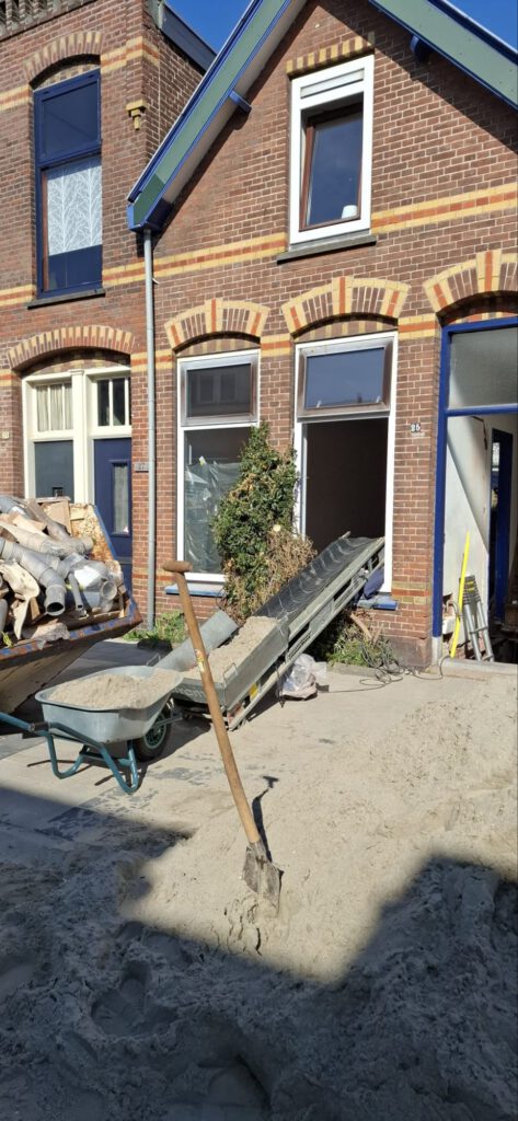 Beneden gaat de aannemer gestaag door. De afwerking van die verdieping laat voorlopig nog even op zich wachten. Stap voor stap is wel de opbouw bezig. De riolering ligt er, de 2e onderslagbalk is vervangen en 8 kuub zand via ’t raam heeft het inmiddels minder apekooien gemaakt. Alle muren zijn ook voorzien van héél véél gaten om ze te kunnen impregneren (sorry voor nog meer herrie…) dus vocht maakt straks geen kans meer – daar duim ik voor ;).