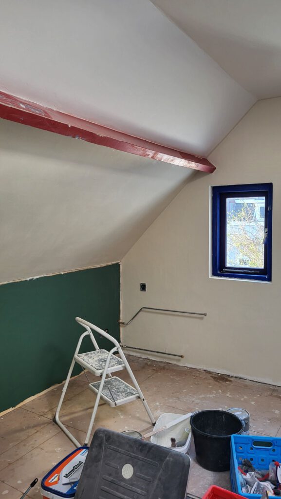 Een maand onderweg alweer, al voelt het veel langer. De laatste doordeweekse klusdagen zijn aangebroken. Halverwege deze week werkt m’n vader weer, gewoon achter een bureau en niet meer in mijn huis. Of nou ja, hij checkt wel even in elke dag om de voortgang te zien en zat op zaterdag volledig onder het rode stof na ’t fresen van de toeleing naar de stopcontacten…