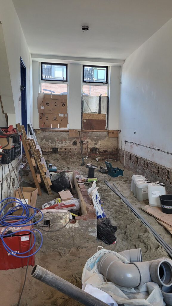 De aannemer heeft gelukkig ook deze week progressie geboekt. De gaten in de muren zijn gevuld met waterglas tegen optrekkend vocht. De gaten naar de buren zijn gedicht en er ligt nu een plastic bak door heel de benedenverdieping. Komende woensdag wordt het schuimbeton gestort en dan hebben we eindelijk weer een soort van vloer…