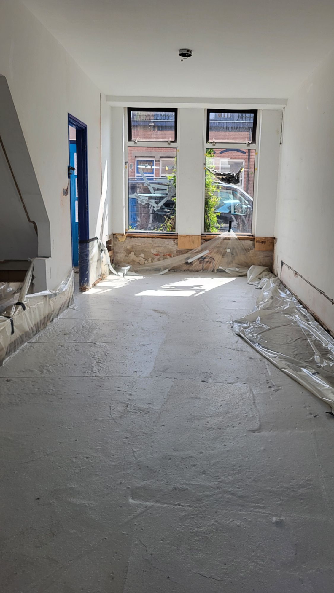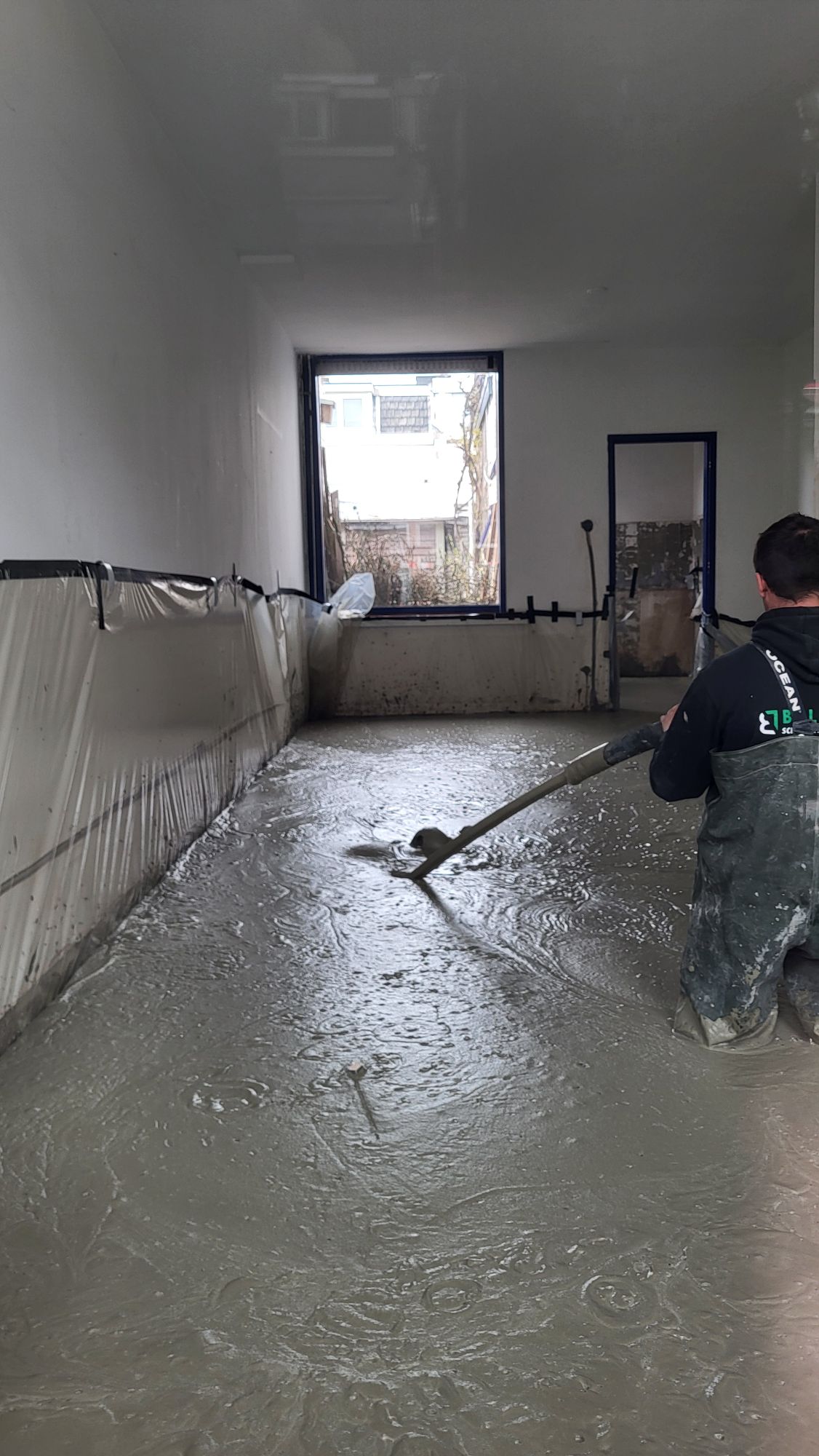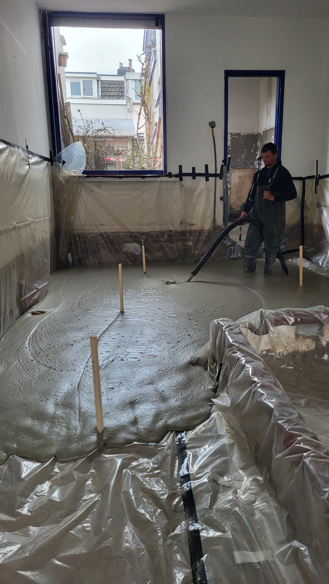 Mijlpaaltje! In het weekend even wat pauze genomen in afwachting van hèt moment: het storten van het schuimbeton. Op woensdagmiddag was het dan zo ver: binnen no time was de keuken en daarna de woonkamer en gang gevuld met een grijze, bubbelige laag schuimbeton. Het apekooien door de benedenverdieping is daarmee definitief ten einde. Na 24 uur uitharden kan ik gewoon, zonder eerst een meter naar beneden te klimmen en te klauteren, weer naar binnen wandelen.