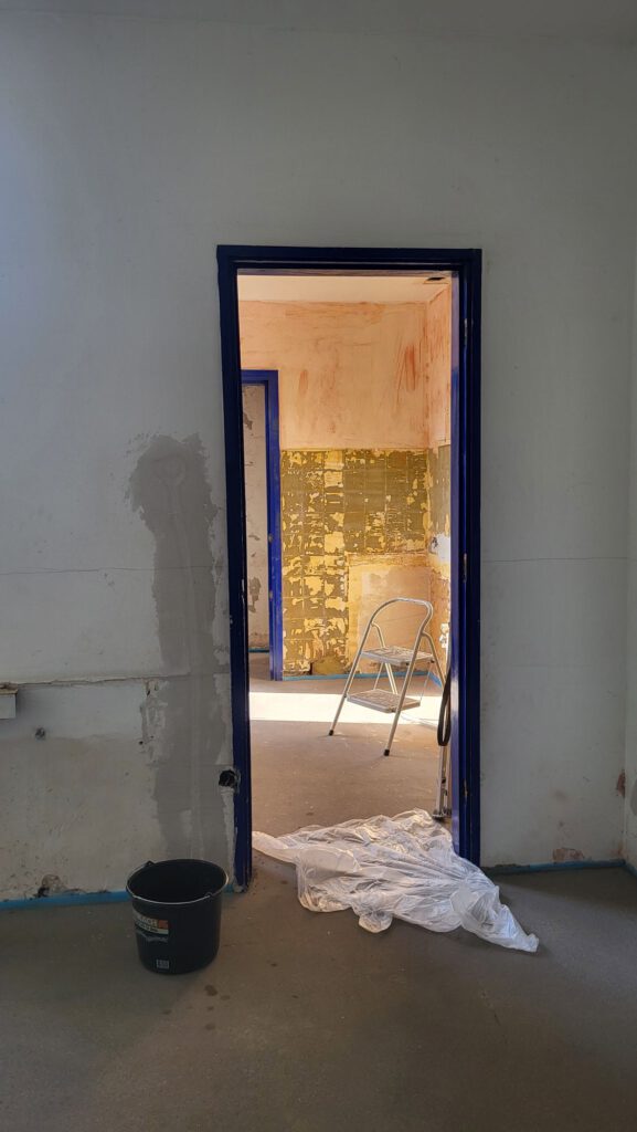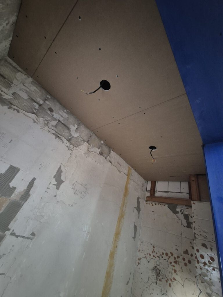 Mijn wc is voorzien van plafond, de stucadoor kan aan de slag. De eerste woonkamerwand staat in de verf en de kozijnen hebben schuurbeurten, grondverf en hun eerste laklaag gekregen.