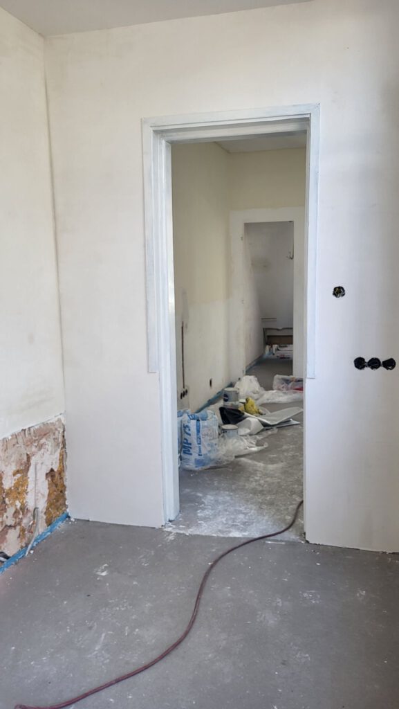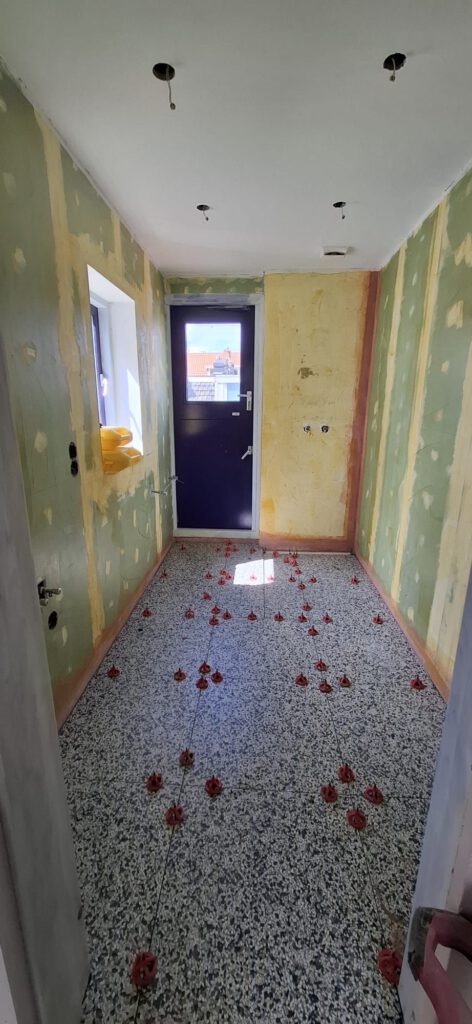 De stucadoor heeft het toilet en de keuken voorzien van een gladde wand en de bouwdroger staat te loeien. Wat zal het straks een mooi plaatje opleveren, als de wc getegeld is en de keuken geïnstalleerd!