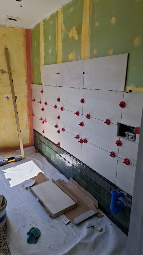 De aannemer heeft de badkamervloer prachtig getegeld, ben helemaal verliefd op het plaatje. Helaas moet het grootste deel van de getegelde wand opnieuw na een miscommunicatie, maar dat mag de pret niet drukken. Ik heb al gezien dat het supermooi gaat worden :).