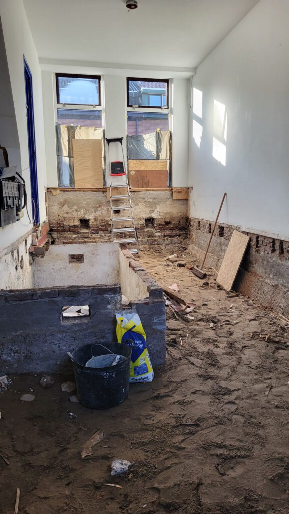 Met het slopen van de benedenverdieping stuitten we helaas ook op wat verrassingen. Dat er meer vloerbalken rot waren dan in het keuringsrapport aangegeven had ik wel verwacht. Is ook niet zo erg met de schuimbetonplannen. Maar dat er tijdens de bouwtechnische keuring een 2e volledig doorgeroeste onderslagbalk is gemist, is wel een beetje jammer. Vooral ook omdat dit vanuit het kruipluik te zien moet zijn geweest. Voordeel van de complete renovatie van de benedenverdieping is dat we hier nu achter komen en m’n keuken- en badkamermuur niet over 3 jaar compleet verzakt is. Nadeel is de kostenverhoging die dit met zich meebrengt. Dat wordt heel veel consignatiediensten draaien…
