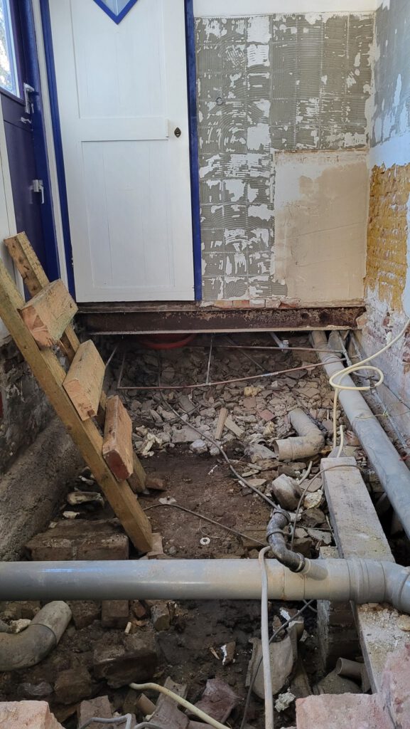 In één dag lag deze week zo goed als de hele benedenvloer eruit. Het gewapende beton in de wc-vloer is niet meer, en ook de laatste kleurrijke resten van de lieveheersbeestjeswcpot zijn gesneuveld. Na wat laatste houten balken en troep weghalen uit de kruipruimte kan ook beneden de wederopbouw beginnen!