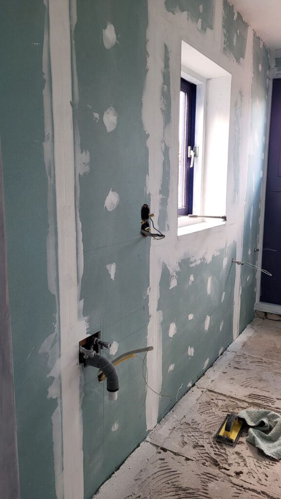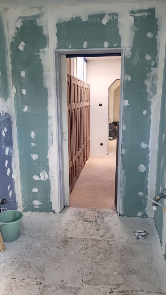 Laten we beginnen met het goede nieuws: boven zijn we een heel eind. De badkamer is dichtgegipst en staat te wachten op de tegelzetter. Alle bovenruimtes zijn voorzien van wanden en zijn of fris geverfd, of worden dat bijna. De elektra is gedaan en de nieuwe radiatoren zijn bezorgd. Nu nog de pvcvloer regelen en dan is het bewoonbaar!